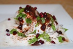 Flour crisps with spiced potato, garbanzo beans topped with yogurt and tamarind-date chutney.