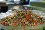 A tangy preparation of yellow peas mixed with a special tamarind-date sweet chutney, spices, ginger and garnished with fresh cliantro