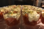 A layered dessert with Coconut Pineapple and rum infused lady finger biscuits, with Pineapple chunks and whipped creme. Garnished with Pineapples and Strawberry Drizzle